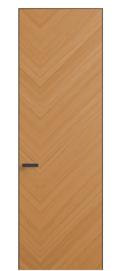 Полотно Рифт в скрытом алюминиевом коробе становится полноценным элементом декора. В коллекции представлено 9 моделей дверей в высоте до 3 метров. Рисунок раскладки шпона варьируется от простого до сложного. «Рубашка» для каждого полотна подбирается вручную по цвету, текстуре и фактуре.