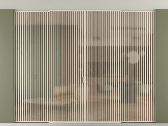 Дополнительно на раздвижную двустворчатую перегородку вдоль стены и четырёхстворчатую перегородку внутри проёма с двумя неподвижным полотнами можно установить механизм синхронного открывания — при открывании одной створки, вторая открывается автоматически.