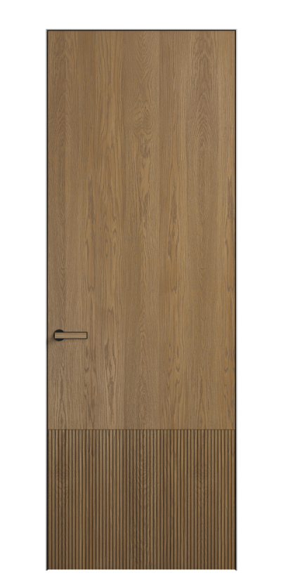 Это полотна с рельефной фрезеровкой. Этот прием делает интерьер объемным, тактильным, вносит интересную текстуру и создает современный образ. Волнистый рельеф может быть выполнен по ламелям из массива дуба в древесных матовых отделках, либо исполнен по натуральному и экологически безопасному материалу — ХДФ, покрытому гладкой эмалью актуальных оттенков.